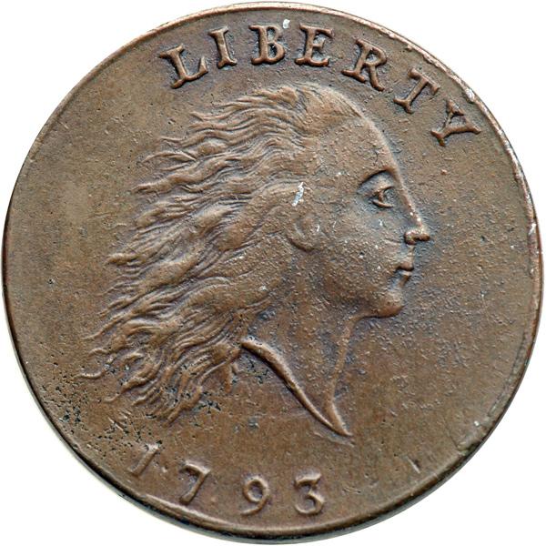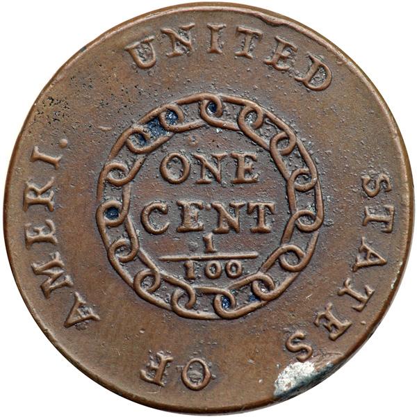 1793 S-1 Chain AMERI. Electrotype Copy. AU-50. Nice glossy light to medium chocolate brown. A tiny spot of underlying base metal shows at the top of the ear and a rim bruise at the second S in STATES uncovered more of the core material. Otherwise this copy appears exactly as the model cent, which was at least AU50. The edge is plain (the Vine and Bars edge device found on genuine examples has not been added).