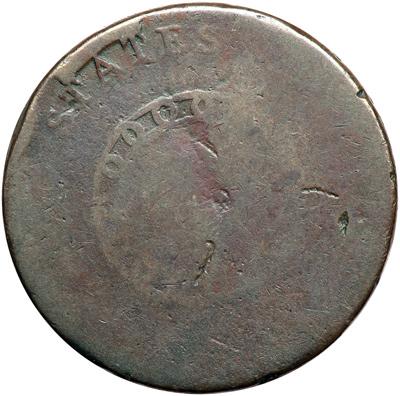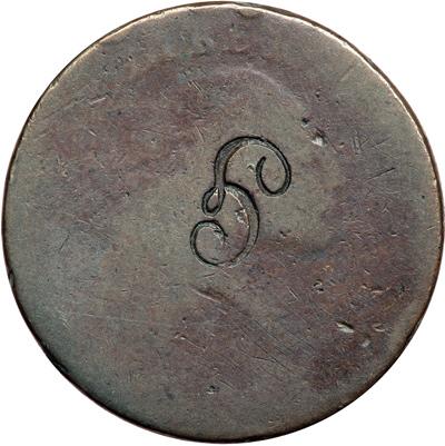 1793 S-1 R4 Chain AMERI. Basal State-1. Nice glossy chocolate brown. The planchet is smooth, completely free of roughness or stains. A script "G" is neatly engraved into the center of the obverse and there are a few small, shallow planchet chips on the reverse. LIBER is still visible, the portrait is faint but nearly complete, and using some imagination you can see hints of the tops of the 93. At least half the chain is visible and STATES is clear, which is fortunate since that's where a strong cud break connects TAT to the rim, Breen's rare terminal state VI. Decent eye appeal for a Basal State Chain Cent, and the cud break makes this cent very special, indeed. DWH #2248.