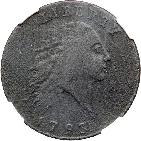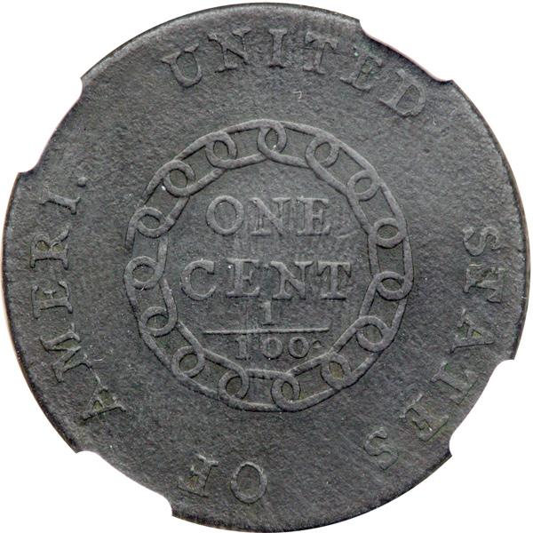 1793 S-1 R4 Chain AMERI. NGC graded VF Details, corrosion. Sharpness VF20 but covered with uniform very fine roughness. No marks or verdigris, and the eye appeal of this cent remains quite nice in spite of the imperfect surfaces. Slightly glossy dark olive and steel. Nicely struck EDS, Breen state I, before any swelling or die cracks. The date and legends are complete and strong and the AMERI feature is bold. Our grade is net F12.