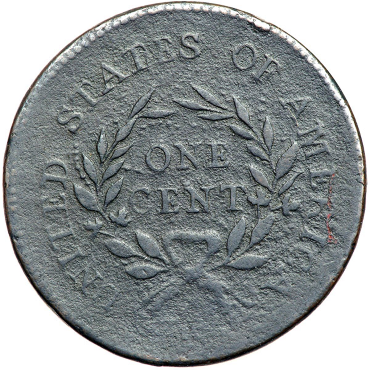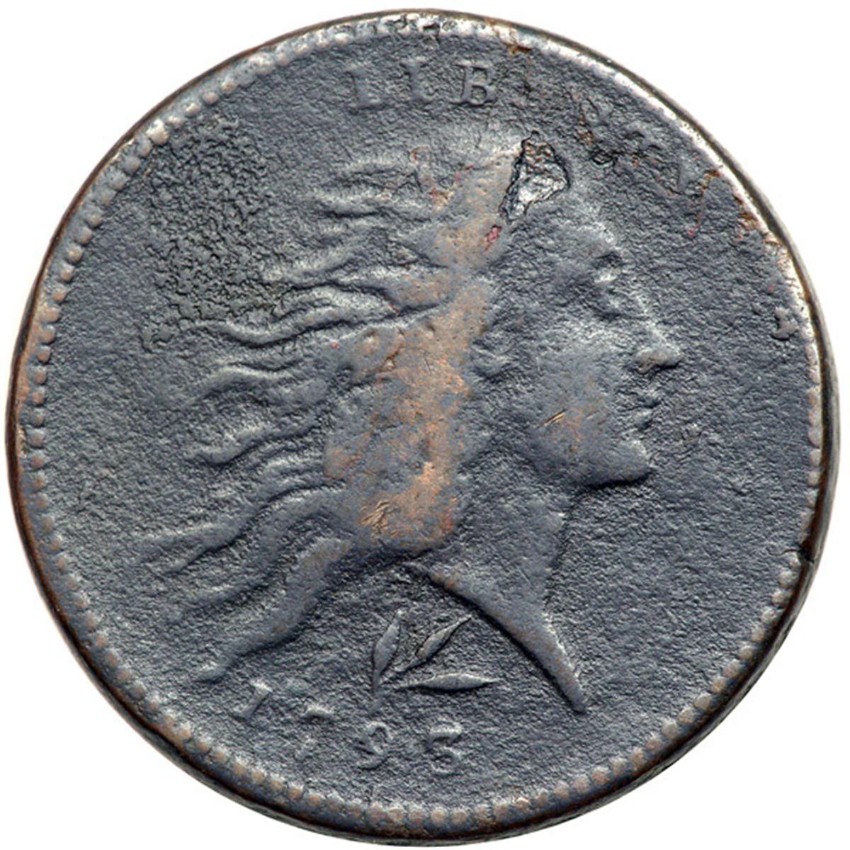 1793 S-11a R4+ Wreath Type with Vine & Bars Edge G6. Sharpness F15 but granular, strongest in the field behind the head. No verdigris. The only notable mark is a planchet void at the top of the head under ER in LIBERTY. Dark olive and steel with chocolate toning on the highpoints of the portrait. The date and legends are clear except for the fraction, which was softly impressed due to being struck slightly off center towards the bottom of the reverse.