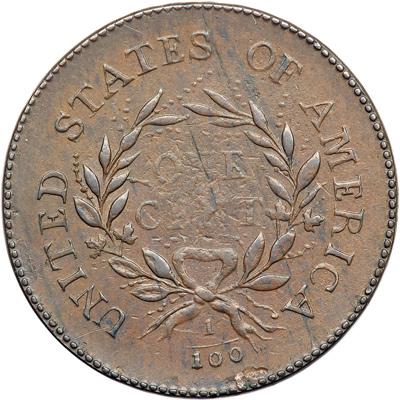1793 S-11b R4 Wreath Cent with Lettered Edge and Double Leaf. PCGS graded AU-53. Frosty medium brown faintly mottled with darker steel brown and chocolate. Lustrous lighter brown toning faded down from mint color shows through in protected areas. The central part of each side is softly impressed, which is characteristic of the late die state, but the remainder of the designs are nicely struck. The softly struck centers show tiny planchet chips that didn’t completely strike out, but the fields outside the centers are choice. Very little actual wear is evident and the eye appeal is excellent overall, perhaps choice on the obverse. The only notable marks are a small planchet delamination at the dentils below the right side of the fraction and a faint, very thin disjointed planchet crease from the right edge of the second S in STATES down to the second A in AMERICA. LDS, Breen state IV. The heavy die clashmarks found earlier have been lapped off the die. Our grade is EF40, tied for CC#3. PCGS Population 1; The finest graded at PCGS for the variety. DWH #3441.