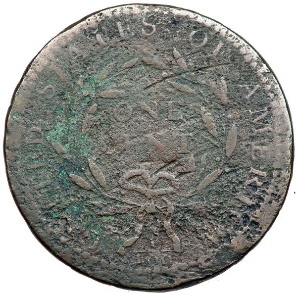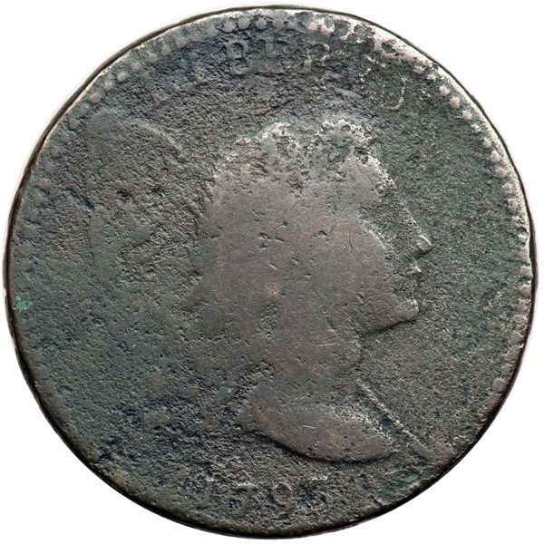 1793 S-13 R4- Liberty Cap AG3. Sharpness at least VG7 but covered with light to moderate corrosion on all but the highpoints, which are smooth. Traces of powdery light green verdigris show in protected areas on the left side of the reverse, and there are a few old, very dull scratches hidden in the toning on the upper two-thirds of the reverse. The toning is a mixture of chocolate brown, light greenish olive, and darker reddish chocolate brown. The smooth highpoints on both sides display some natural gloss. The date and legends are complete and easily readable in spite of the roughness. Holmes #1804.