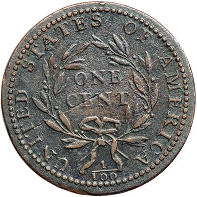 1793 S-13 R4- Liberty Cap. Fine-15. Sharpness VF30 but the surfaces are slightly rough. The roughness is mostly hidden under a glossy patina of dark chocolate brown and olive with lighter chocolate brown on the devices. No verdigris, and the only marks of any significance are a few minor planchet fissures, as struck. A shallow fissure extends from the top of the cap across to the dentils above the end of the pole while another parallel one shows in the hair left of the eye. On the reverse there is a single very thin fissure reaching from the rim at T in UNITED to the rim just left of the first A in AMERICA. This fissure is exactly parallel to the obverse fissures so they all follow the same stress lines in the rolled copper. A tiny rim nick over the second S in STATES and a barely visible rim bruise just left of the fraction are the only contact marks on this otherwise attractive if slightly imperfect Liberty Cap cent. EDS, Breen state I, before any swelling at NT in CENT. Well struck and nicely centerd on the planchet with strong, full border beads on both sides. DWH #3567.