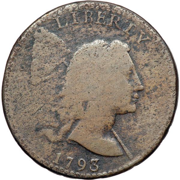 1793 S-13 R4- Liberty Cap VG7+. Slightly sharper but covered with microscopic roughness, strongest in the protected areas while the devices are nearly smooth. No verdigris or contact marks. Slightly glossy medium brown with chocolate toning in the protected areas. The contrast in toning accents the devices and give this piece the look of an even higher grade. The date is bold and the legends are clear. Late die state, Breen state II, with obvious swelling inside the wreath that weakens ENT in CENT. The eye appeal of this cent is quite nice in spite of the minor roughness.