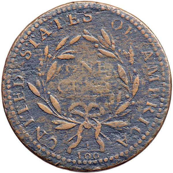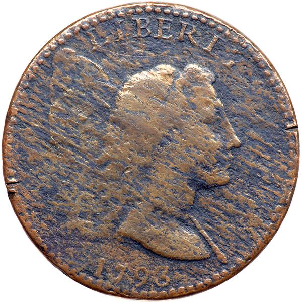 1793 S-13 R4- Liberty Cap. VG-10. Sharpness VF20 but the planchet is lightly eroded showing faint parallel planchet striations across both sides, clearest on the obverse. No verdigris and only a few trivial signs of contact. These include a couple tiny rim nicks left of the curls and one more opposite the eye. Slightly glossy golden brown with dark olive brown in protected areas. Nicely centered with clear border beads around both sides. The date and legends are complete and easily readable. The edge lettering is bold. MDS, Breen state II, with minor swelling at NT in CENT.