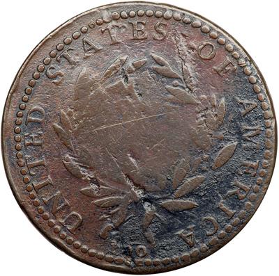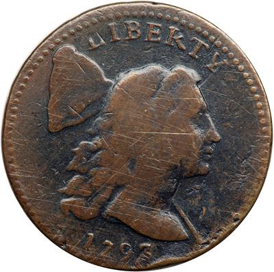 1793 S-15 R7- Liberty Cap. VG-7. Sharpness F12 with fine hairline scratches on the obverse, mostly on the portrait, and a few light rim bruises on both sides, strongest one under the bust tip. There is a small planchet lamination through the bottom half of the 3 and a dozen small planchet voids on the reverse slanting from the upper left down to the lower right, strongest at the ribbon. The obverse is glossy medium chocolate brown with darker olive brown toning in protected areas, the contrast accenting the details. The reverse is mostly glossy reddish chocolate brown with dark olive covering the protected areas on the lower right. This darker area contains some very light crud or verdigris. The date is strong (although the bottom half of the 3 is distorted slightly by the lamination), and the legends are strong, except for ONE CENT, which is weakened by the usual swelling in the center of the reverse. Later die state, the crack down through Y and reverse swelling both strong. Called net VG7 and tied for CC#4 in the Bland census. Noyes says net G6 and sixth finest known, his photo #20341. DWH #0009.