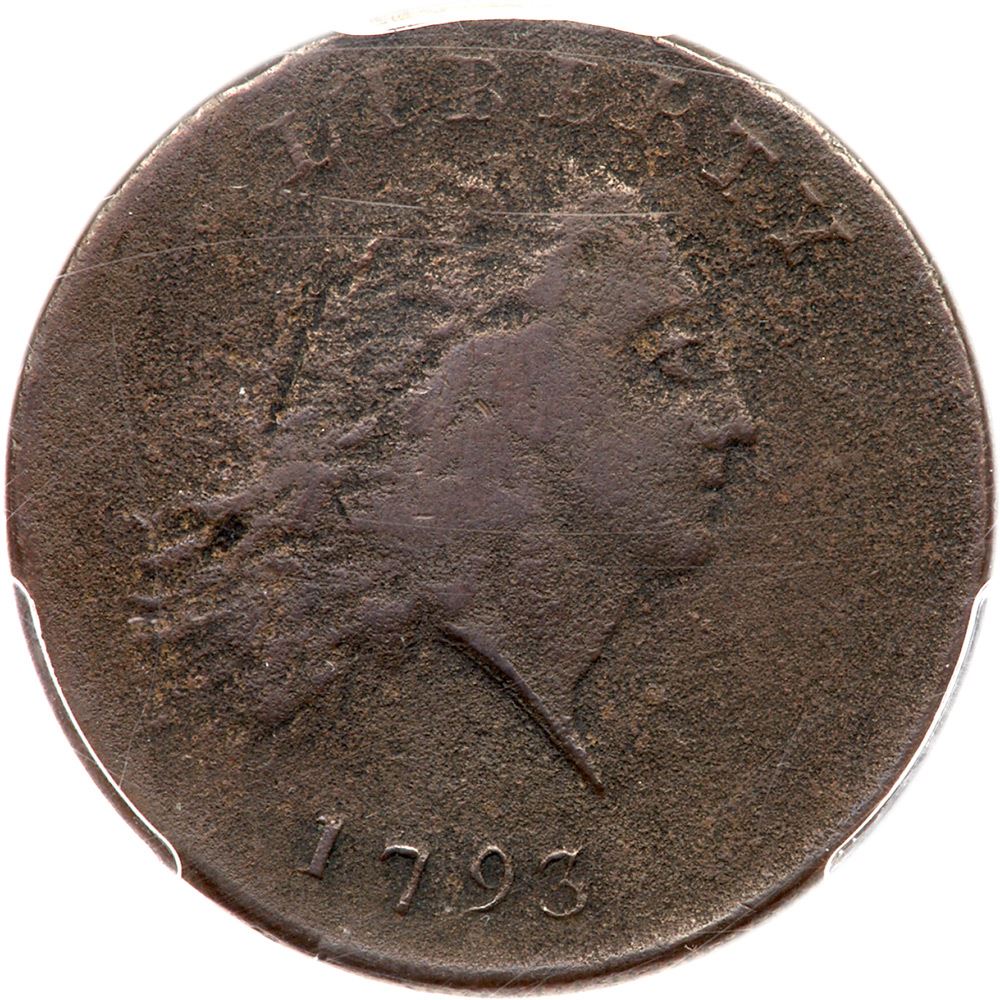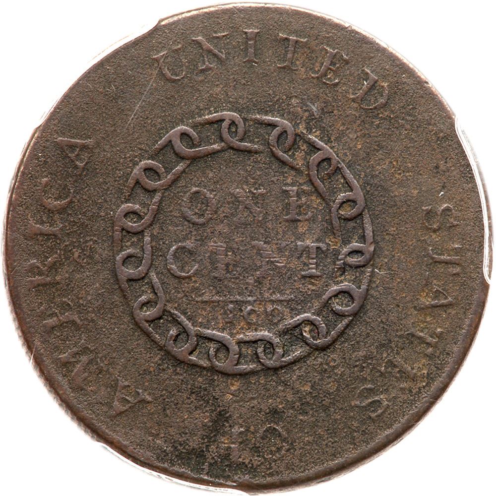 1793 S-3 R3- Chain AMERICA. PCGS graded F15. Medium chocolate and olive brown. The planchet is covered with fine to moderate granularity and there is an area of shallow corrosion over OF on the reverse. No verdigris and the only contact marks are a light scuff across ENT in CENT. The date is strong and the legends are all readable. Our grade is VF25 sharpness net VG10. PCGS #1341. Estimated Value 7,000 - UP