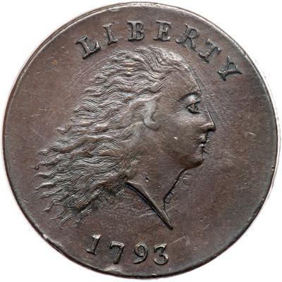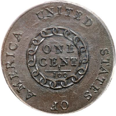 1793 S-3 R3- Chain AMERICA. PCGS graded MS-63 Brown. Levick Plate Coin. Lustrous uniform chocolate brown. A very attractive Chain Cent with choice surfaces and a flawless planchet. Satiny mint frost covers the protected areas on the reverse. There is a touch of friction on the highest points of the portrait while the reverse is virtually pristine and offers choice mint state eye appeal. The only marks are a tiny rim bruise under the 7 in the date and a dull pinprick low on the neck. Late die state, Breen state III, with strong die clashmarks on the obverse and subtle die bulges on the reverse. Called EF45 and tied for CC#6 in the Bland census. Noyes says AU55 net EF45 and tied for CC#6, but he does not list a photo of the coin and may not have seen it other than in a plated auction catalog. Our grade is AU50+, close to AU55. The obverse of this cent was pictured on the Crosby-Levick Plate of 1793 Cents published in the April 1869 issue of the American Journal of Numismatics. PCGS Population 5; 1 in 64 Brown; 1 in 65 Brown; 1 in 67 Brown. DWH #3532.