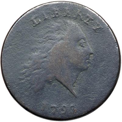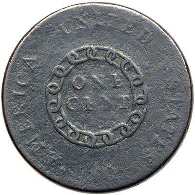 1793 S-3 R3- Chain AMERICA. VG-8. Sharpness F12 but covered with microscopic roughness on all but the highpoints of the design, which are smooth. No verdigris, contact marks, or planchet flaws. The date and legends are complete and easily readable. Rather glossy dark olive and steel with chocolate toning on the smooth highpoints. Not perfect, of course, but a well balanced and reasonably attractive example for the grade.