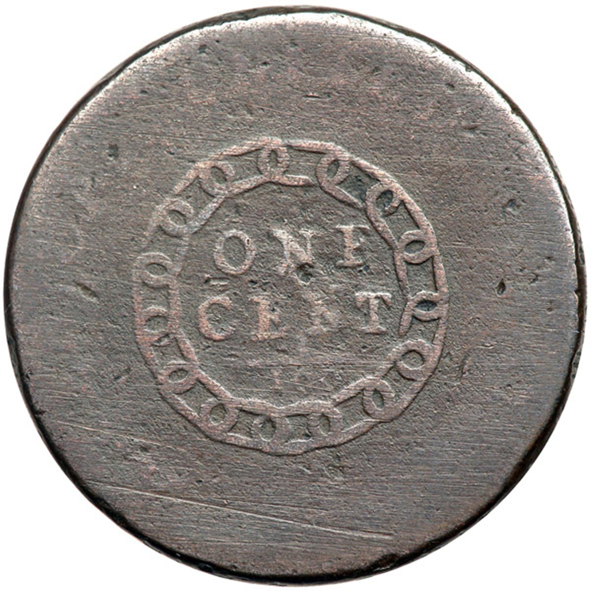 1793 S-4 R3 Chain AMERICA with Periods AG3. Rather glossy chocolate and steel. There are myriad fine, light scratches covering both sides. The fields show extremely faint roughness while the devices are smooth. No verdigris. A dull nick under the L in LIBERTY and a small pit on the bottom of the N in ONE are good identifying marks. Only the upper half of the date remains visible, and it is faint. LIBERTY is complete and the reverse legends are mostly visible, especially the chain and legend inside.