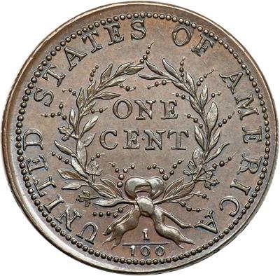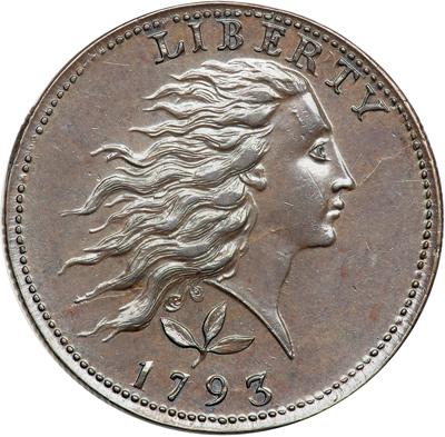 1793 S-5 R4 Wreath Cent with Large Date and LIBERTY. PCGS graded MS-65 Brown. Choice glossy medium steel brown with smooth, prooflike fields on both sides and traces of bluish steel overtone in the fields and protected areas. No spots or stains, and the only contact mark is a very light and barely visible dull diagonal hairline scratch on the cheek under the eye. The best identifying marks are a tiny planchet chip on the rim opposite the chin and a microscopic chip in the field midway between the center of the neck and the dentils at the right, both as struck. None of these defects is visible without a strong glass and the eye appeal of this cent is outstanding. The reverse is gem. Sharply struck EDS, Breen state I. The dentils over LIBERTY do not show any trace of crumbling and the fields are reflective. Called MS65 and second finest in the Noyes census. Bland says MS61 and tied for second finest. Our grade is MS63 prooflike. Removed from an NGC slab graded SPECIMEN-65 BN (NGC label included, and the label shows the S-5 attribution and their assessment that this is a Specimen strike). The reverse is plated in The United States Coinage of 1793 by Sylvester S. Crosby (1897). DWH #2482.