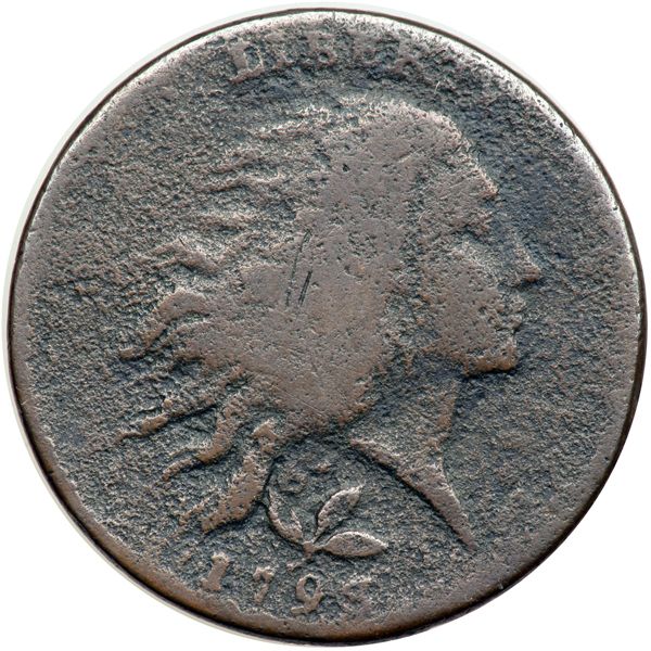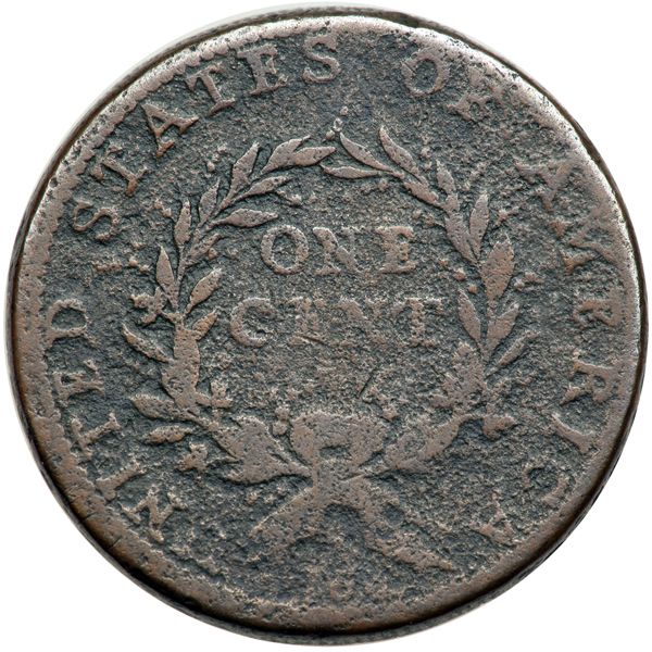 1793 S-6 R3 Wreath Cent G5. Several points sharper but covered with fine roughness on all but the highpoints, which are mostly smooth. No verdigris or notable marks. The legends and devices are light chocolate brown while the protected areas display a darker shade of olive brown toning. The date and legends are complete and easily readable in spite of the fine roughness. E-MDS. The usual swelling in the field behind the head is just starting to show. Holmes #1799.