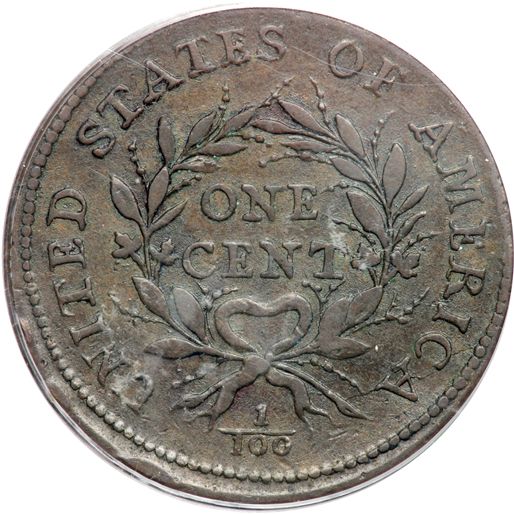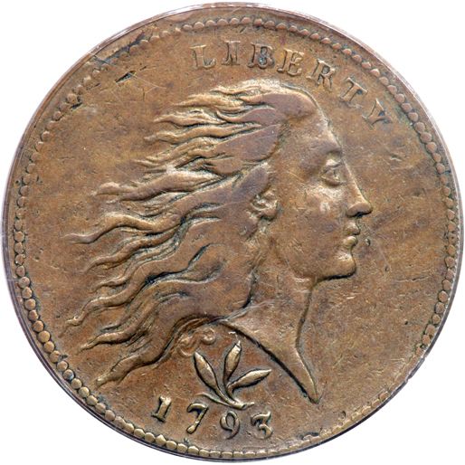1793 S-9 R2 Wreath Cent. PCGS graded EF-40, CAC Approved. Vine & Bars Edge. The obverse is glossy medium brown fading to light chocolate while the reverse is a more uniform glossy light olive and medium chocolate brown with slightly lighter brown in protected areas. No corrosion or verdigris and only a few minor marks. These include a couple tiny planchet flakes at the border beads left of the top of the head and a couple more at the border beads under the bust tip (all as struck), and three light rim bruises at UNIT. Nicely struck E-MDS, Breen state III, with a die crack through CA to the wreath stem and ribbon but not extending through the ribbon to the fraction bar. The obverse is rather well centered on the planchet but the reverse is off a bit to K-1 leaving some of the border beads off the planchet. A smooth, very attractive Wreath Cent. Our grade is VF30.