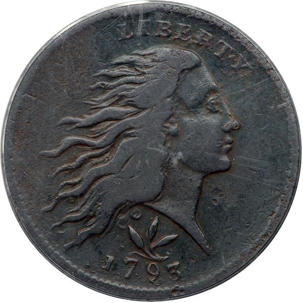 1793 S-9 R2 Wreath Cent with Vine & Bars Edge Device. PCGS graded Fine-15. Rather glossy dark steel and chocolate with traces of lighter reddish brown and chocolate toning in protected areas. The surfaces are covered with extremely faint roughness mixed with small spots of shallow verdigris, but this piece appears smooth to the unaided eye. The only notable mark is a dull but rather deep horizontal scratch close above the fraction bar extending to the wreath stem at the right. The date and legends are strong. E-MDS, Breen state II, with a faint die crack from the rim through CA to the stem and ribbon. Our grade is F15 sharpness net VG10. The Vine & Bars edge device is noted on the PCGS label.