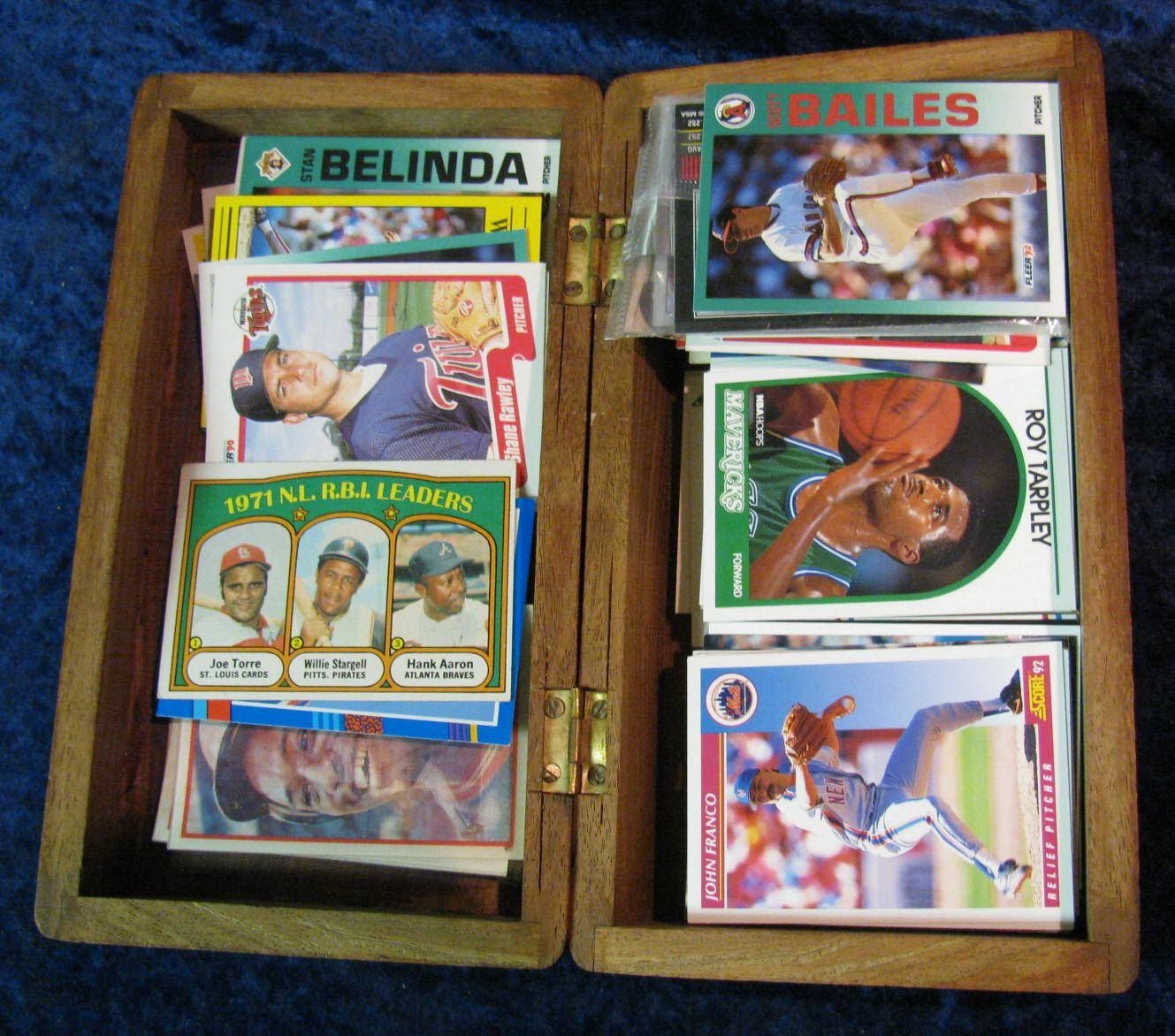 1793. Wooden Box Carved with Mother-of-Pearl Inlays containing a large group of Baseball Cards from the late 80s to early 90s. One unopened pack has a Roger Clemens on top.