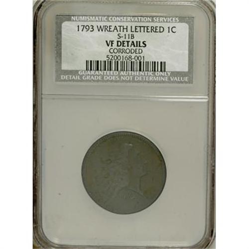 <B>1793 1C Wreath Cent--Lettered Edge, Corroded--NCS. VF Details.</B></I> S-11b, R.4, per NCS insert. Medium brown surfaces reveal micro porosity, slightly heavier on the obverse, that also shows some fine scratches on the portrait. Nevertheless, all of the design elements are quite clear, except for minor weakness in the 3 of the date. EAC 8.<BR><BR><B>Coin Engraver:</B> Henry Voigt<BR><BR><b>Shipping:</b> Coins & Currency (<a target="_blank" href="http://www.heritageauctions.com/common/shipping.php">view shipping information</a>)