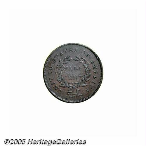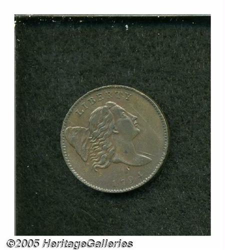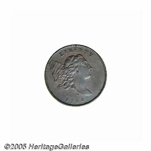 <B>1794<1/2 C> AU55 Obverse Scratch, Uncertified.</B></I> Large Letters Edge, B-1a, C-1a, R.3. A well struck light golden-brown Half Cent that has only faint highpoint wear on the portrait. A vertical pinscratch is on the field near the profile, a tiny dig is above the 9 in the date, and a nick on the reverse rim is at 2 o'clock. Struck from boldly clashed dies. Despite the physical challenges, this is a pleasing example with excellent color and eye appeal for the variety.