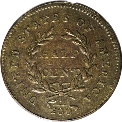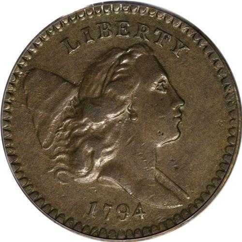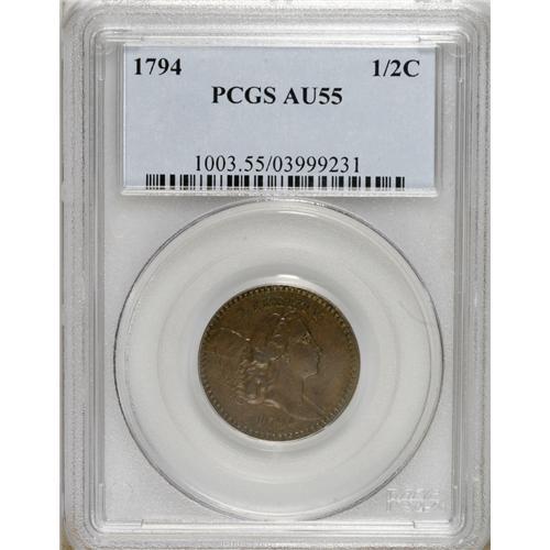 <B>1794 1/2 C AU55 PCGS.</B></I> C-9, B-9, R.2. Die State III. This is the "High Relief Head" obverse, with the 4 in the date almost touching the bust. The reverse is of the "Heavy Wreath" type, with five berries on the left branch, and four on the right. The dentils to the left of the fraction have merged together into a minor rim break (barely discernible in the holder), which along with the crack through the tops of IBERTY and another from the rim at 9 o'clock through the cap, is indicative of this later die state.<BR> This Choice AU example displays pleasing semi-glossy light brown surfaces. The dentilation exhibits the usual boldness on the obverse, but is weaker on portions of the reverse. A few minute marks are noted on Liberty's cheek and neck. Overall, a pleasing early half cent. EAC 35.<BR><BR><b>Shipping:</b> Coins & Currency (<a target="_blank" href="http://www.heritageauctions.com/common/shipping.php">view shipping information</a>)