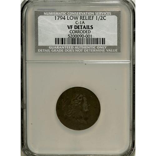 <B>1794 1/2 C Low Relief--Corroded--NCS. VF Details.</B></I> C-1A. NGC Census: (32/214). PCGS Population (18/176). Mintage: 81,600. Numismedia Wsl. Price for NGC/PCGS coin in VF20: $1,825. (#1003)<BR><BR><b>Shipping:</b> Coins & Currency (<a target="_blank" href="http://www.heritageauctions.com/common/shipping.php">view shipping information</a>)