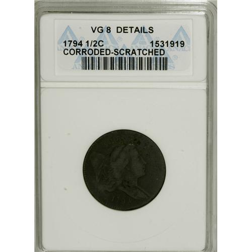 <B>1794 1/2 C --Corroded, Scratched--ANACS. VG8 Details.</B></I> NGC Census: (4/189). PCGS Population (8/254). Mintage: 81,600. Numismedia Wsl. Price for NGC/PCGS coin in VG8 : $750. (#1003)<BR><BR><b>Shipping:</b> Coins & Currency (<a target="_blank" href="http://www.heritageauctions.com/common/shipping.php">view shipping information</a>)