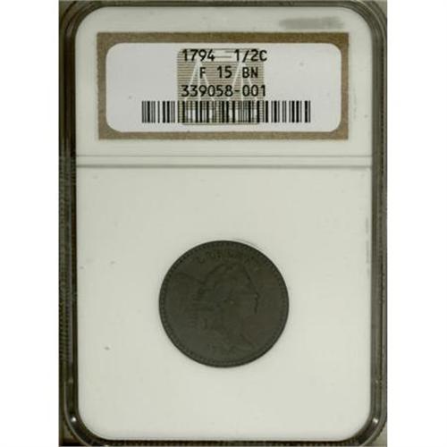 <B>1794 1/2 C Fine 15 NGC.</B></I> C-9, B-9, R.2. This is the so-called High Relief Head variety, which some numismatists consider to be a separate type from all other 1794 half cents. This example displays deep charcoal-brown coloration and smooth surfaces that are faintly glossy and free of any severe marks. A couple of shallow adjustment marks reside near the upper reverse border, at 2 o'clock and 10 o'clock, respectively. EAC 8.<BR><I>From The Casa Becca del Norté Collection.</B></I><BR><BR><B>Coin Engraver:</B> Robert Scot<BR><BR><b>Shipping:</b> Coins & Currency (<a target="_blank" href="http://www.heritageauctions.com/common/shipping.php">view shipping information</a>)