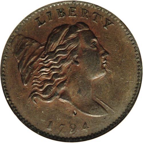 <B>1794<1/2 C>--Scratched--ANACS. AU Details.</B></I> Large Letters Edge, C-1a, B-1a, R.3. This coin, unattributed by ANACS, is found in the R.6 Small Letters Edge and R.3 Large Letters Edge varieties. Since the edge lettering cannot be seen within the (old-style) ANACS slab, the more common Large Letters Edge is presumed. This lovely coin is in Breen Die State II, with clash marks visible around Liberty's chin and within the wreath. A die crack joining the tops of IB is in the earliest stage. The ANACS-noted long, straight scratch in the right obverse field runs from just below the Y nearly to the rim at 4 o'clock, but it has long since toned over. The surfaces are otherwise choice and largely distraction-free, with medium brown color accented by glints of muted red and olive that appear under a light. EAC 20.