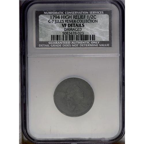 <B>1794<1/2 C> Small Edge Letters. C-7, B-7, High R.5. Die State 2--Damaged--NCS. VF Details. Good 5 EAC.</B></I> High relief head; Vertical leaf pair below T. The die state is early in the Manley State 2 progression, and appears to qualify as Breen Die State II. A die crack through the E of UNITED has separated the reverse die into two different planes, almost suggesting a retained cud. The surfaces have intermingled dark olive and steel-brown color with numerous small abrasions, pit marks, and other blemishes, including a rather prominent old scratch through the digit 1 to the bust. The lower reverse shows a very slight bend. Breen listed 14 entries in his Condition Census, the final entry reading "Richard Shimkus collection. Very Fine." We do not know if he was referring to this coin or a different specimen. A number of examples have been discovered over the years. Cohen rated this R.6 and said it was almost R.7. Breen called it R.6 with 24 reported, stating that it may go down to R.5. More recently, Ron Manley rated the variety R.5, in this instance proving the forward thinking of Walter Breen.<BR><I>Ex: Richard Shimkus; Roger S. Cohen, Jr.; Jim McGuigan (7/9/1982).</B></I> Envelope Included.