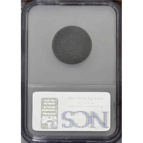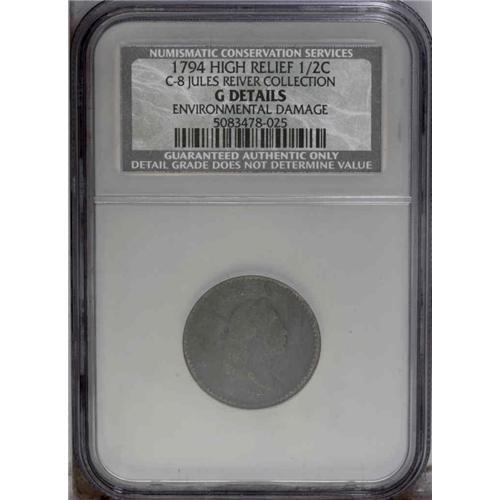 <B>1794<1/2 C> Small Edge Letters. C-8, B-8, R.5. Die State 2--Environmental Damage--NCS. Good Details. AG3 EAC.</B></I> High relief head; Short fraction bar. The obverse shows considerably sharper details than the reverse. Both sides have dark steel-brown color intermingled with splashes of olive-brown, including the borders on both sides. Lightly burnished. The reverse is rotated a few degrees counterclockwise. A reverse die crack through the second T of STATES shows faintly on this example. Envelope Included.