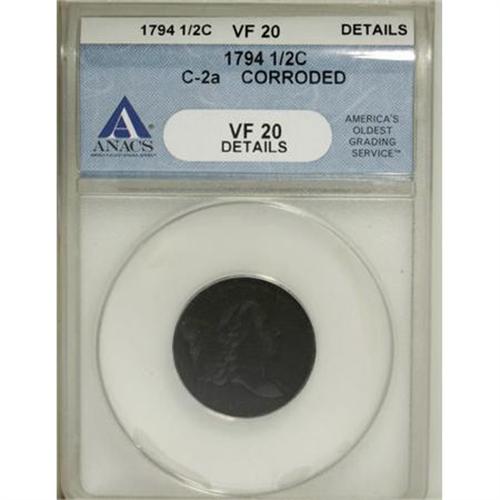 <B>1794 1/2 C --Corroded--ANACS. VF20 Details.</B></I> C-2a. NGC Census: (6/92). PCGS Population (18/179). Mintage: 81,600. Numismedia Wsl. Price for NGC/PCGS coin in VF20: $1,850. (#1003)<BR><BR><B>Coin Engraver:</B> Robert Scot<BR><BR><b>Shipping:</b> Coins & Currency (<a target="_blank" href="http://www.heritageauctions.com/common/shipping.php">view shipping information</a>)