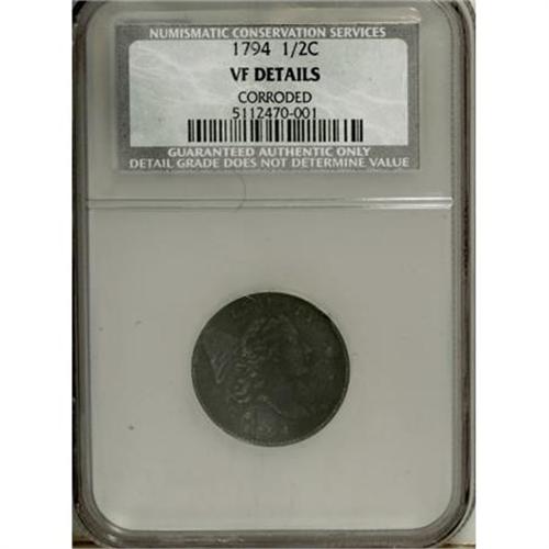 <B>1794 1/2 C --Corroded--NCS. VF Details.</B></I> NGC Census: (25/120). PCGS Population (17/173). Mintage: 81,600. Numismedia Wsl. Price: $1,825. (#1003)<BR><BR><B>Coin Engraver:</B> Robert Scot<BR><BR><b>Shipping:</b> Coins & Currency (<a target="_blank" href="http://www.heritageauctions.com/common/shipping.php">view shipping information</a>\)