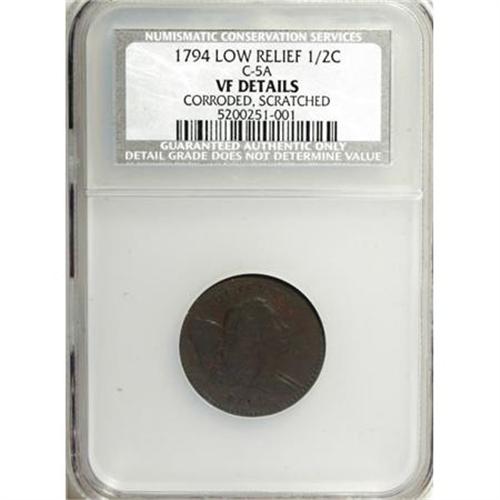 <B>1794 1/2 C Low Relief--Corroded, Scratched--NCS. VF Details.</B></I> C-5A. NGC Census: (6/92). PCGS Population (18/180). Mintage: 81,600. Numismedia Wsl. Price for NGC/PCGS coin in VF20: $1,825. (#1003)<BR><BR><B>Coin Engraver:</B> Robert Scot<BR><BR><b>Shipping:</b> Coins & Currency (<a target="_blank" href="http://www.heritageauctions.com/common/shipping.php">view shipping information</a>)