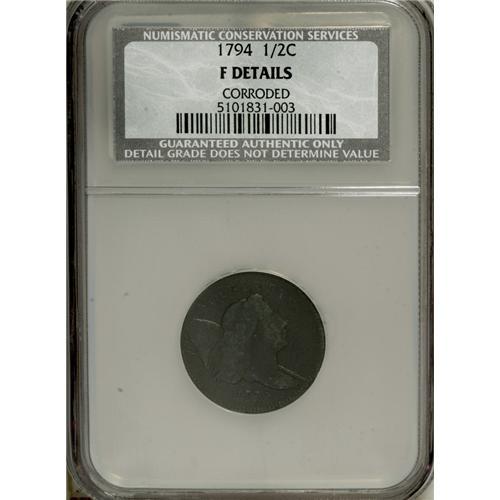 <B>1794 1/2 C --Corroded--NCS. Fine Details.</B></I> NGC Census: (25/121). PCGS Population (17/176). Mintage: 81,600. Numismedia Wsl. Price: $1,825. (#1003)<BR><BR><b>Shipping:</b> Coins & Currency (<a target="_blank" href="http://www.heritageauctions.com/common/shipping.php">view shipping information</a>)