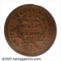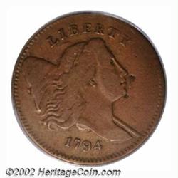 1794 1/2 C VF30 PCGS. B-6b, C-4, R.3. We are certain that this attribution is correct in that this coin was struck from the marriage of Breen's Obverse 4 and Reverse E. On the other hand, we cannot see the edge, so we do not know whether or not the lettering is large or small. As the Large Edge Letters variety (B-6a) is an R.8 with just three examples known to Breen, it is likely that this coin is an example of the Small Edge Letters, B-6b variety. The attractive, medium brown surfaces are evenly worn over the central design elements. We do, however, note that the denticles are sharper at the left borders than they are at the right. A foreign object seems to have been encapsulated with the coin on the reverse below the final A in AMERICA, and a few planchet voids (as struck) are seen in the obverse field immediately before Liberty's profile. There is also a mentionable reverse scrape in the field after the N in UNITED. Important notice: We expect to be auctioning lots at the rate of 200-250 per hour. Sometimes eBay Premier live bid software cannot keep up with that pace, so we strongly recommend that you place a realistic proxy bid now as insurance to avoid disappointment. Also please note that all Heritage/CAA lots purchased through eBay Premier carry a 20% Buyer's Premium. Please make sure you read the Terms and Conditions.