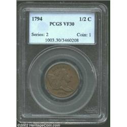 1794 1/2 C VF30 PCGS. B-6b, C-4, R.3. We are certain that this attribution is correct in that this c