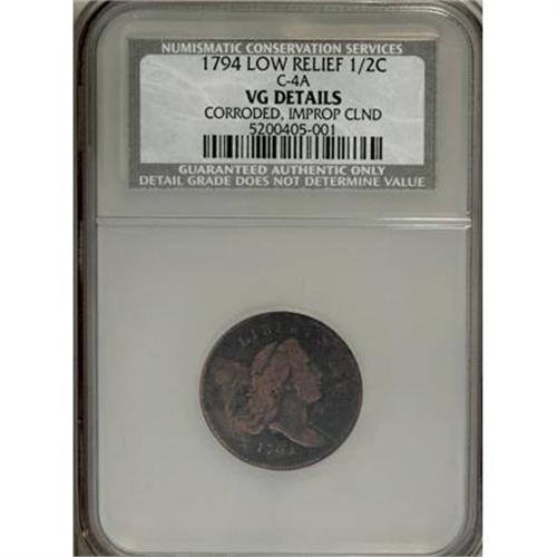 <B>1794 1/2 C Low Relief--Corroded, Improperly Cleaned--NCS. VG Details.</B></I> C-4A. NGC Census: (2/118). PCGS Population (8/259). Mintage: 81,600. Numismedia Wsl. Price for NGC/PCGS coin in VG8 : $765. (#1003)<BR><BR><B>Coin Engraver:</B> Robert Scot<BR><BR><b>Shipping:</b> Coins & Currency (<a target="_blank" href="http://www.heritageauctions.com/common/shipping.php">view shipping information</a>)