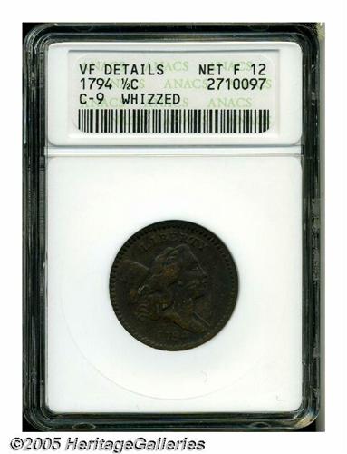 <B>1794<1/2 C>--Whizzed--ANACS. VF Details, Net Fine 12.</B></I> B-9, C-9, R.2. A bold survivor with curious streaky mahogany, aqua, and tan colors. The surfaces are moderately granular, the reverse rim has a minor ding at 7 o'clock, and a few light pinscratches are distributed across the reverse border.