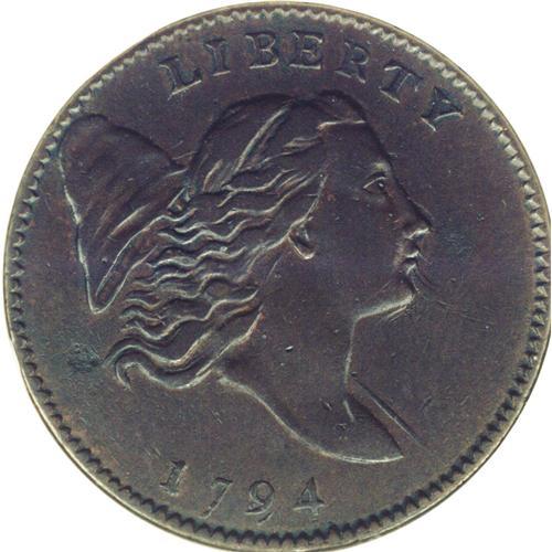 <B>1794<1/2 C> XF40 ANACS.</B></I> C-1a, B-1a, R.2. Cleaned and very attractively recolored with deep steel toning on each side. A few minor blemishes are seen in the obverse fields, including a small corrosion spot just left of the lowest hair curls. This is a distinctive design type, with the head of Liberty high in the field, far from the date. This is an example of the usually seen late die state with prominent obverse and reverse clash marks. EAC 20.