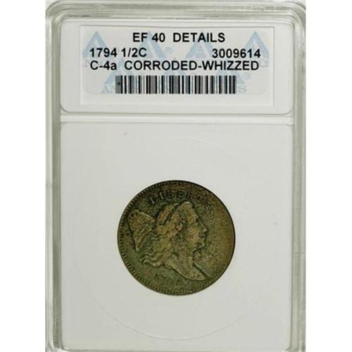 <B>1794 1/2 C --Corroded, Whizzed--ANACS. XF40 Details.</B></I> C-4a, B-6b, R.3. All legends are bold and the types are clear, but the lavender-brown surfaces are pitted, and the surfaces have been whizzed to remove verdigris. EAC 12.<BR><BR><B>Coin Engraver:</B> Robert Scot<BR><BR><b>Shipping:</b> Coins & Currency (<a target="_blank" href="http://www.heritageauctions.com/common/shipping.php">view shipping information</a>)