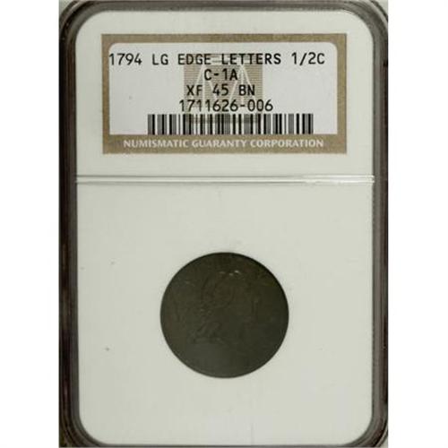 <B>1794 1/2 C XF45 NGC.</B></I> C-1a, B-1a, R.3. The Large Letters Edge, per the NGC label. This mahogany-brown representative has bold legends with the exception of the date, which is legible although faint. Light clash marks are present near the mouth and the H in HALF, but the surfaces are only lightly abraded for the grade. EAC 25.<BR><I>From The Arnold & Harriet Collection.</B></I><BR><BR><B>Coin Engraver:</B> Robert Scot<BR><BR><b>Shipping:</b> Coins & Currency (<a target="_blank" href="http://www.heritageauctions.com/common/shipping.php">view shipping information</a>\)