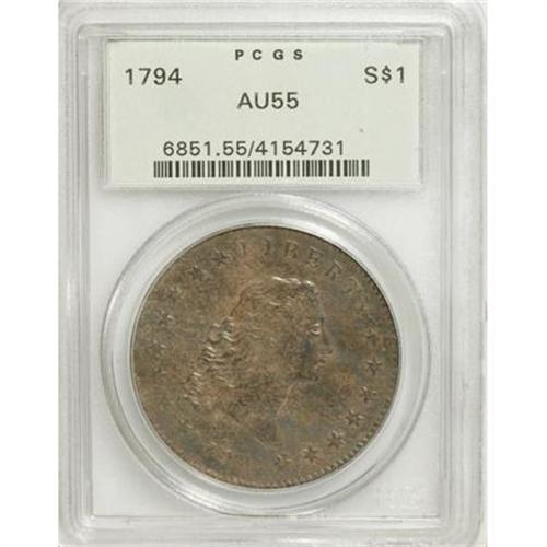 <B>1794 $1 AU55 PCGS.</B></I> B-1, BB-1, R.4. In 1791, prior to the striking of any official U.S. coins, two different issues were debated between the Executive and Legislative branches regarding coinage. One concerned the necessity of coinage and the need for a mint, the other addressed who or what should be depicted on U.S. coinage.<BR> President Washington addressed the need for a mint in his Third Annual Address:<BR><BR> "The disorders of the existing currency, and especially the scarcity of small change--a scarcity so peculiarly distressing to the poorer classes, strongly recommend the carrying into immediate effect, the resolution already entered into concerning the establishment of a mint. Measures have been taken, pursuant to that resolution, for procuring some of the necessary artists together with the requisite apparatus."<BR><BR> In other words, Washington had done what he could do, now it was up to Congress.<BR> Beginning in January debates began regarding presidential portraits on coins. Shortly thereafter, Peter Getz presented his pattern silver half dollars with a portrait of Washington and small eagle. House debate in March largely objected to a presidential portrait. Representative John Page delivered a succinct and prophetic summation of the danger of a presidential portrait: "However well pleased they [the citizens] might be with the head of the great man now their President, they may have no great reason to be pleased with some of his successors." The House voted to retain the "device emblematic of Liberty," and the Senate followed suit in late March.<BR> Once the ground rules were established and actual coinage began to be produced, Washington's suggestion to first deal with the "scarcity of small change" was heeded. Half dismes were produced the following year with half cents and large cents following in 1793. The silver dollar was not coined until 1794, and then only 1,758 pieces were struck. Of that number originally produced, it is estimated that today only 130 or so pieces are known in all grades. This is obviously one of the finer 1794 dollars extant. Most are low grade and problem-ridden. This coin last appeared in auction in 1990, and a comparison to the auction photo plate suggests that some minor strengthening may have subsequently been done to a few of Liberty's hair curls, and that a couple of planchet laminations appear to have been filled in or otherwise reduced. That said, this is a remarkable 1794 dollar, sharply detailed throughout, with just the slightest weakness seen on the first two stars. Both sides display mottled golden toning with slight gray-violet overtones. The most obvious identifiers are a shallow planchet void beneath the L in LIBERTY and another diagonal planchet flaw to the left of the O in OF. <BR> This is an exceptional opportunity for the early dollar collector or a collector who simply wants to acquire premier rarities.<BR><I>Ex: Unnamed collection from Troy, New York, that was formed between the 1840s and 1894; purchased by Dr. Charles F. French in the 1930s; Dr. Frothingham (French's, 11/1973), lot 737; 1974 Central States Auction (RARCOA, 5/1974), lot 257; The Scott Collection (Bowers and Ruddy, 6/1975), lot 963; Buddy Ebsen Collection (Superior, 5-6/1987), lot 1873; Four Landmark Collections (Bowers and Merena, 3/1989), lot 1932; American Rare Coin Fund; A Cabinet of Rarities (Bowers and Merena, RCR # 78, 1990), lot 130; October Sale (Superior, 10/1990), lot 3710.<BR>From The Chandler Collection.</B></I><BR><BR><B>Coin Engraver:</B> Robert Scot<BR><BR><b>Shipping:</b> Coins & Currency (<a target="_blank" href="http://www.heritageauctions.com/common/shipping.php">view shipping information</a>)