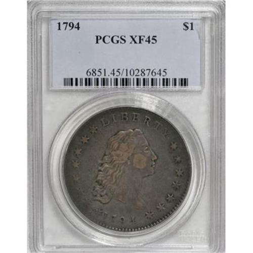 <B>1794 $1 XF45 PCGS.</B></I> B-1, BB-1, R.4. Far finer than the usual strike, with every digit, star, and letter on the obverse completely outlined. Both sides have complete borders with the solitary exception of about 8 o'clock on the obverse, exactly opposite the minor radial adjustment marks that are found near D and S on the reverse. It is known that adjustment marks on one side of a coin are responsible for weakness on the other side. The same cannot be said for later scratches, and provides an easy method of differentiation. This example probably ranks among the top 20% of all known pieces in terms of its strike. <BR> The 1794 is clearly a centerpiece coin for any important numismatic cabinet. In 1997, the Eliasberg cataloger wrote: "Over a long period of years, indeed virtually since day one of American numismatic interest, the 1794 silver dollar has been highly prized. Research by the late Jack Collins indicates that the population of known pieces is somewhere between 125 and 135 specimens, the precise number is indeterminable, as not all have appeared in auctions. Moreover, some auction listings are undoubtedly duplicated, as many early descriptions are not precise enough to establish pedigree links and were not photographed. The median grade for known 1794 dollars is about VF25."<BR> Among the early numismatic scholars was Mint Director James Ross Snowden, who penned <I>The Cabinet Collection of the Mint of the United States</B></I> in 1860. On page 107, he described the first silver coinage: <BR> "The first deposit of silver bullion for coinage took place on the 18th day of July, 1794. The deposit was made by the Bank of Maryland, and consisted of ‘coins of France,' amounting to eighty thousand seven hundred and fifteen dollars seventy-three cents and five-tenths ($80,715.73.5.)<BR> "The first return of silver coins from the Chief Coiner to the Treasurer was made on the fifteenth day of October, and comprised 1758 dollars. The second delivery was on the first day of December, and consisted of 5300 half dollars. This embraced the entire silver coinage of the year. There was a small coinage of half dimes, but they were only struck as pattern pieces, for the purpose of trying the dies, and were not regularly issued."<BR> The first silver dollars were clearly inadequate, due to the lack of a screw press large enough to strike them. The largest coinage press available at the time was intended to coin large cents and half dollars, rather than silver dollars. Recently, some researchers including Walter Breen have suggested the mintage of 1794 silver dollars was actually higher than the net distribution. Breen placed the number at 2,000 coins. The theory is that the remaining coins (242 based on Breen's estimate) were rejected because they were too weak, and were saved for later use as "planchets." Dave Bowers supports Breen's theory through the existence of two 1795 silver dollars that were actually struck over 1794 silver dollars. Opposing the theory is the fact that all coins the Mint produced were immediately returned to the depositors of silver, and later gold. Such a requirement would make it impossible to save coins for later use as planchets.<BR> This 1794 dollar has remarkable surfaces with attractive pale gray, lilac, and lighter highpoint toning. A tiny mark behind the head, and another attached to the top of the A in STATES are convenient pedigree markers. The reverse adjustment marks along the left border between D and S, have already been described. This is a highly desirable example that will easily be a highlight in the buyer's collection.<BR><I>Ex: Charles P. Britton Collection (Edward Cogan, 1/1883); S.H. & H. Chapman (6/1889), lot 190; E.S. Norris Collection (S.H. & H. Chapman, 5/1894), lot 24; J.M. Clapp; John H. Clapp; Clapp Estate (1942); Louis E. Eliasberg, Sr.; Eliasberg Estate (Bowers and Merena, 4/1997), lot 2167.</B></I><BR><BR><B>Coin Engraver:</B> Robert Scot<BR><BR><b>Shipping:</b> Coins & Currency (<a target="_blank" href="http://www.heritageauctions.com/common/shipping.php">view shipping information</a>)