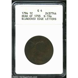 1794 1C Head of 1793--Blundered Edge Letters--Good 4 ANACS. S-19a, Low R.6. An error at the Mint resulted in the edge of this important Cent reading ONEONE HUNDRED FOR A DOLLAR. As a major variety, the 1794 Head of 1793 is one of the rarest in the Liberty Cap series. Noyes (1991) lists only eight die marriages of the 1794 Head of 1793, two of which are considered non-collectible (High R.8), and the remaining six of which have rarity factors that range from R.4 to Low R.7. The present example presents remarkably well for the Good level of preservation. True, the wear is heavy with waning definition over the upper right reverse and much of the peripheral devices. On the other hand, the denomination ONE CENT is discernible, the obverse portrait is suitably well outlined, and the word LIBERTY is relatively clear. The date is barely discernible. There are no individually mentionable circulation marks, and the mostly smooth surfaces exhibit pleasing golden-brown patina. A coin that should have little trouble finding its way into an advanced collection of early copper. Important notice: We expect to be auctioning lots at the rate of 200-250 per hour. Sometimes eBay Premier live bid software cannot keep up with that pace, so we strongly recommend that you place a realistic proxy bid now as insurance to avoid disappointment. Also please note that all Heritage/CAA lots purchased through eBay Premier carry a 20% Buyer's Premium. Please make sure you read the Terms and Conditions.