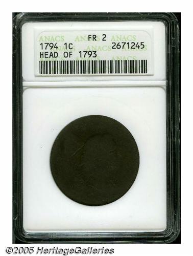<B>1794<1C> Head of 1793 Fair 2 ANACS.</B></I> S-19b, High R.4. The less rare "Edge of '94" subvariety is presumed. This well worn dark brown example has a couple of noticeable scratches on the reverse. The date and most of STATES OF AMERICA are worn smooth, but the long wreath stems and arrangement of curls behind the head identify the variety.