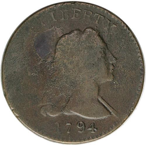 <B>1794<1C> Head of 1793. S-17a, B-1a, Low R.5--Environmental Damage--NCS. VF Details. VG7 EAC.</B></I> The 1794 Head of '93 Cents continued the original design by Joseph Wright, with minor modifications. The main modification to the design comprised the border elements, which now consist of dentils rather than beads. This is an early die state, either State I or State II per the descriptions by Walter Breen. There appears to be evidence of a bulge between Liberty's head and the letter L. Surface quality does not permit an exact determination. The surfaces are lightly corroded with dark olive color. A few smoothed areas are visible on both sides, particularly on the cap. The reverse has a small rim bruise below the right ribbon end. Although clearly not a Condition Census example, this is an important and desirable piece.<BR><I>Ex: W.E. Johnson (3/21/1958); John A. Schreuder; Del Bland (5/27/1970).</B></I> Envelope Included.