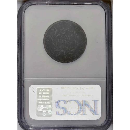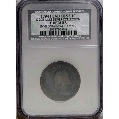 <B>1794<1C> Head of 1793. S-20b, B-4b, R.4--Environmental Damage--NCS. Fine Details. VG8 EAC.</B></I> Like all of the Head of '93 Cents, the shallow engraving of the reverse die now appears as weakened details. Pleasing olive-brown surfaces, slightly lighter in appearance on the devices. It is possible that the surfaces may have been lightly burnished, leading to the NCS description, but if they have been smoothed in some way, it was a careful operation. Many examples of this variety are dark and often have surface roughness stemming from the original planchet quality. Although the Rarity-4 rating suggests that about 125 to 150 examples exist, the Condition Census is quite low. The top dozen coins include examples down to a grade of Fine 12, based on EAC grading standards.<BR><I>Ex: Penn Valley (12/1966).</B></I> Envelope Included.