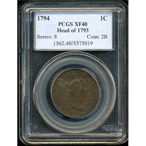 <B>1794 1C Head of 1793 XF40 PCGS.</B></I> S-19b, B-3b, High R.4. Because this piece is slabbed, we cannot be certain about the subvariety or edge type, thus we assume that it is the more common S-19b, rather than the rare S-19a. In fact, an example of S-19a in this grade would approach the finest known position in the Condition Census. As it is, we believe that this example is one of the 20 finest pieces of the S-19b die marriage. Both sides have medium olive-brown color intermingled with lighter tan and darker steel. The surfaces are subdued and minutely granular. EAC 20.<BR><BR><b>Shipping:</b> Coin/Currency (<a target="_blank" href="http://www.heritageauctions.com/common/shipping.php">view shipping information</a>)
