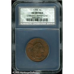 <B>1794 1C Head of 1794 AU Details, Corroded, Improperly Cleaned, NCS.</B></I> S-31, R.1. The dusky orange-tan color is unnaturally light, the central reverse is somewhat pitted, and the surfaces are moderately grainy. Nonetheless, a bold representative of the 'Second Marred Field' variety, only the IT in UNITED shows weakness. Lot:5114