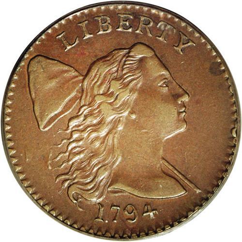 <B>1794<1C> Head of 1794 AU55 PCGS.</B></I> S-31, R.1. The Second Marred Field variety, named for two prominent die chips in the lower left obverse field. The double lower hair lock is also nearly unique to S-31, found only on one other variety, S-30. This lovely chocolate-brown example is bold and glossy, and is unmarked aside from a few tiny ticks on the neck and a minor rim ding at 5 o'clock on the reverse. A charming piece that will highlight the quality of a specialized holding of 1794 cents. EAC 30.