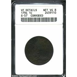 1794 1C Head of 1794--Corroded--ANACS. VF Details, Net VG8. S-57, R.1. A dark and pitted example of the popular 'button' variety. The cheek has a couple of faint abrasions. A rim ding is noted below the date. Important notice: We expect to be auctioning lots at the rate of 200-250 per hour. Sometimes eBay Premier live bid software cannot keep up with that pace, so we strongly recommend that you place a realistic proxy bid now as insurance to avoid disappointment. Also please note that all Heritage/CAA lots purchased through eBay Premier carry a 20% Buyer's Premium. Please make sure you read the Terms and Conditions.