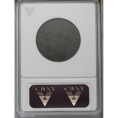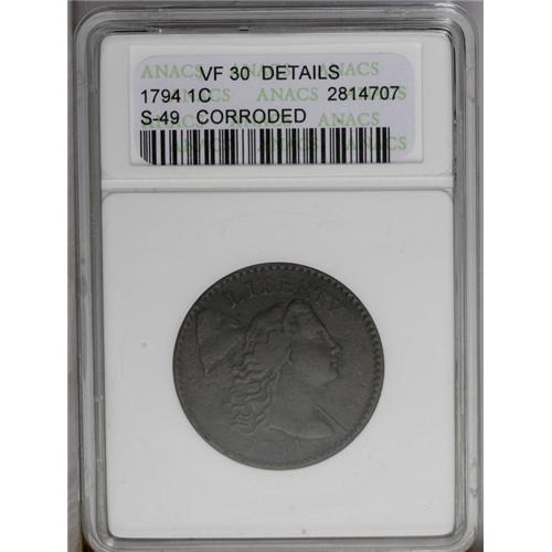 <B>1794 1C Head of 1794--Corroded--ANACS. VF30 Details.</B></I> S-49, R.2. The vertical die crack through the upright of the E in LIBERTY is present, but not yet prominent. A dark example with moderate pitting and verdigris that do not affect the definition. EAC 12.